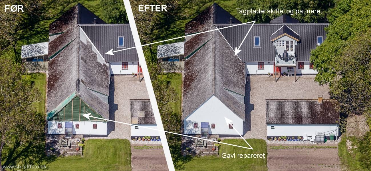 Her kan du f.eks. se et landejendom, hvor de få nye tagplader er blevet skiftet ud med gamle og hvor gavlen er blevet repareret.